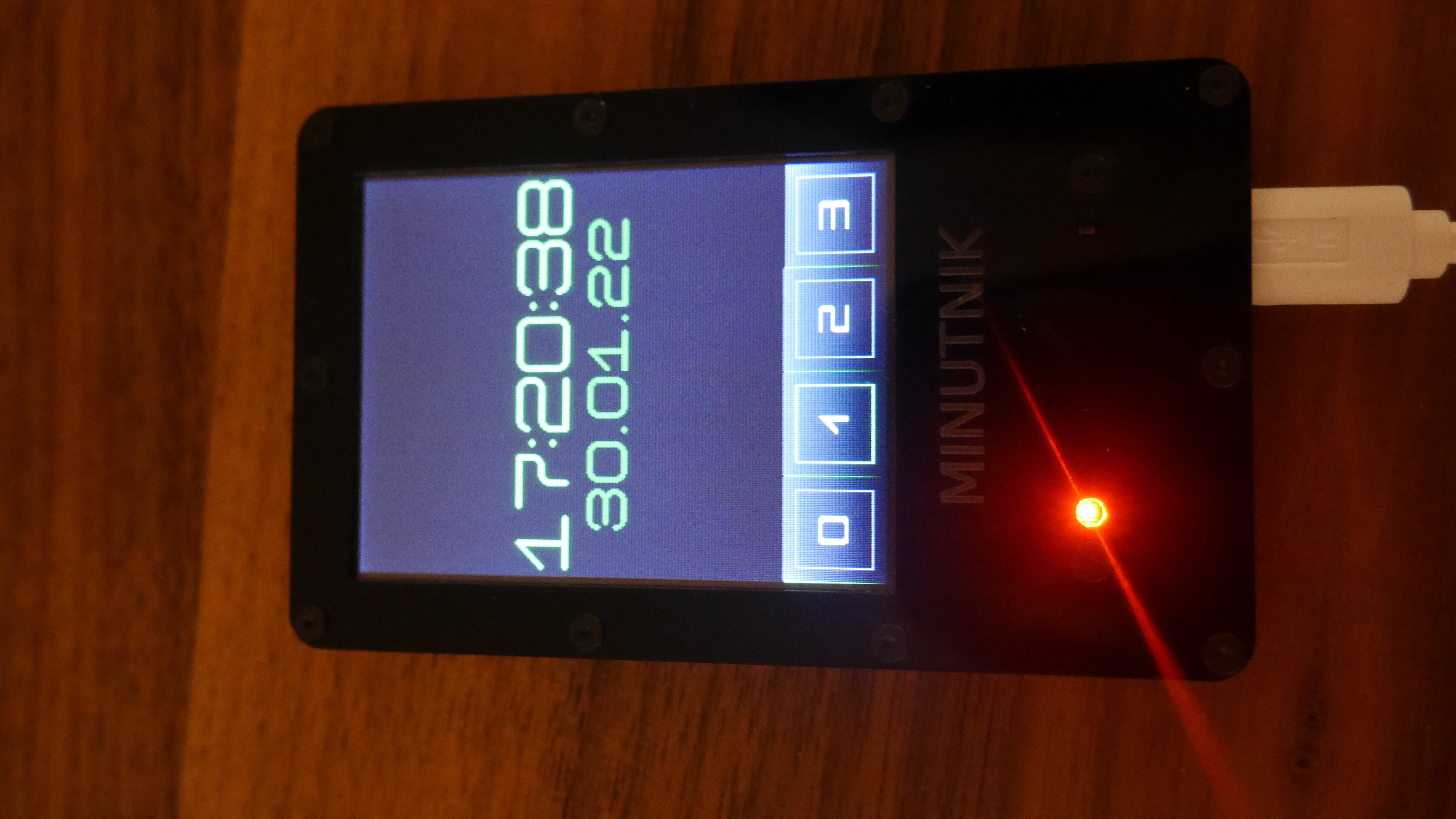 The preinstalled bringup-software is intended to test basic functionality of the board. It shows an clock on the display, blinks LEDs and beeps when display is touched.